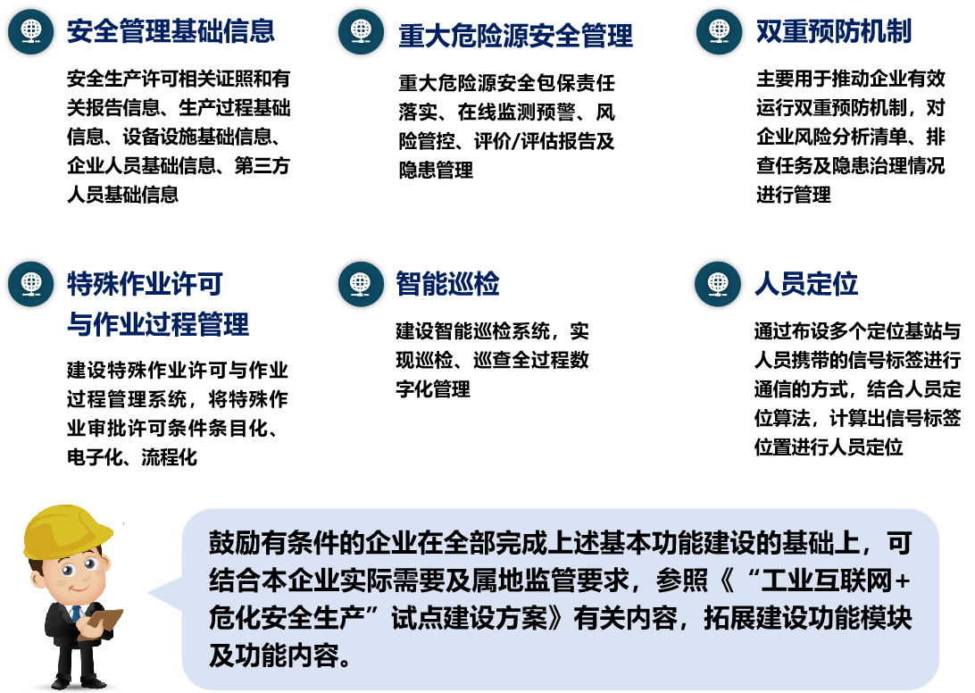 危險化學品企業安全風險智能化管控平臺建設堅持以有效防范化解重大安全風險為目標,突出安全基礎管理、重大危險源安全管理、安全風險分級管控和隱患排查治理雙重預防機制、特殊作業許可與作業過程管理、智能巡檢、人員定位等基本功能,打造企業“工業互聯網+危化安全生產”新基礎設施建設,推動企業安全基礎管理數字化、風險預警精準化、風險管控系統化、危險作業無人化、運維輔助遠程化,為實現危險化學品企業安全風險管控數字化轉型智能化升級注入新動能。