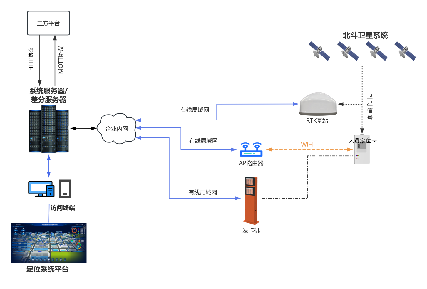 無4G網絡依賴是該方案的核心優勢之一,也是其適配礦山場景的關鍵所在。傳統高精度定位方案多依賴4G網絡進行差分數據傳輸和定位信息回傳,在礦山偏遠區域往往因網絡覆蓋不足而無法使用。新銳科創的北斗RTK+WiFi融合定位方案,通過構建獨立的工業級無線通信網絡,實現了定位數據的閉環傳輸。基準站、WiFi AP與定位服務器之間通過工業以太網或無線網橋進行數據交互,移動終端(人員定位卡、車輛定位終端)則通過北斗RTK模塊或WiFi模塊與網絡進行通信,全程無需依賴任何公共通信網絡。這一設計不僅解決了偏遠礦山無網絡覆蓋的定位難題,還提升了定位系統的安全性和穩定性,避免了因公共網絡擁堵、中斷導致的定位失效問題。