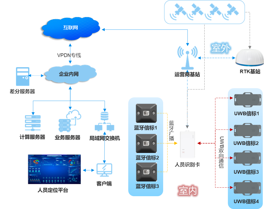 新銳科創(chuàng)基于多模融合定位技術(shù),自主研發(fā)了4G+藍牙+UWB+GPS/北斗RTK融合定位系統(tǒng),該系統(tǒng)以衛(wèi)星為主要定位手段,利用RTK差分定位技術(shù)提升衛(wèi)星定位精度,利用藍牙或UWB來輔助衛(wèi)星定位,彌補衛(wèi)星信號在某些區(qū)域覆蓋的不足,保障衛(wèi)星信號較弱區(qū)域的定位精度,從而實現(xiàn)室外全場景覆蓋的高精度定位。系統(tǒng)拓?fù)鋱D如下: