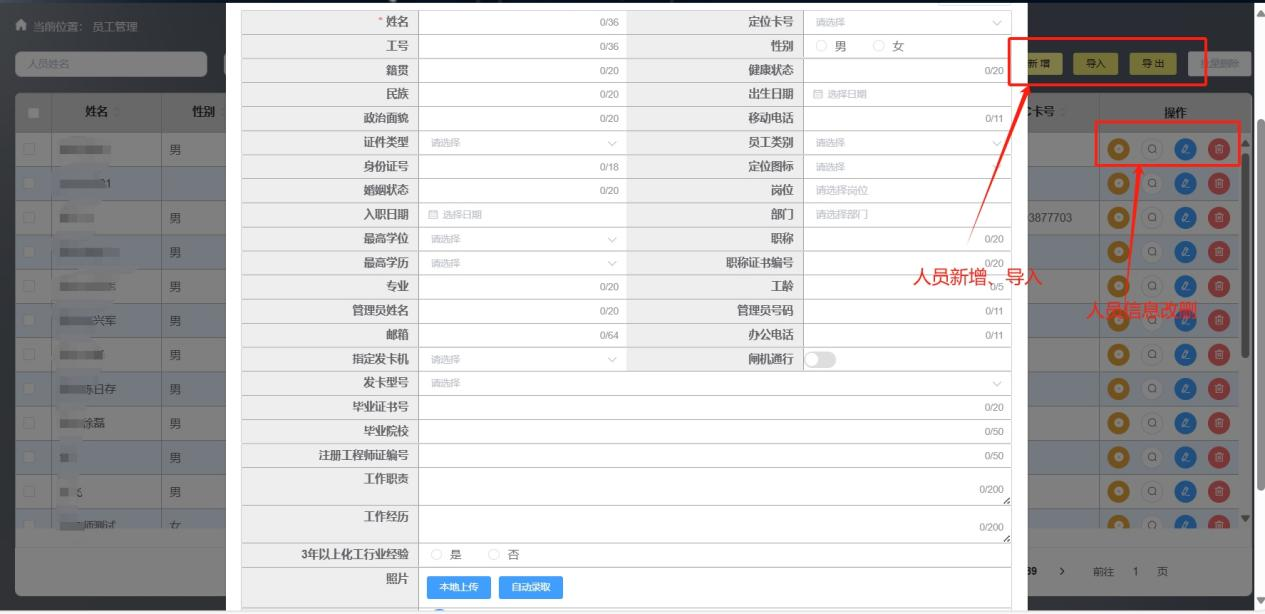 新銳科創的人員定位管理系統首先具備完善的基本信息管理功能。系統能夠錄入并管理員工、承包商及訪客的基本信息,包括單位名稱、姓名、年齡、工種、培訓情況等,為后續的定位追蹤和安全管理提供基礎數據支持。