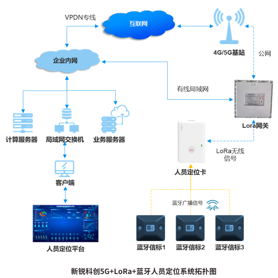 5G+LoRa+藍(lán)牙人員定位系統(tǒng)網(wǎng)絡(luò)拓?fù)鋱D如下: